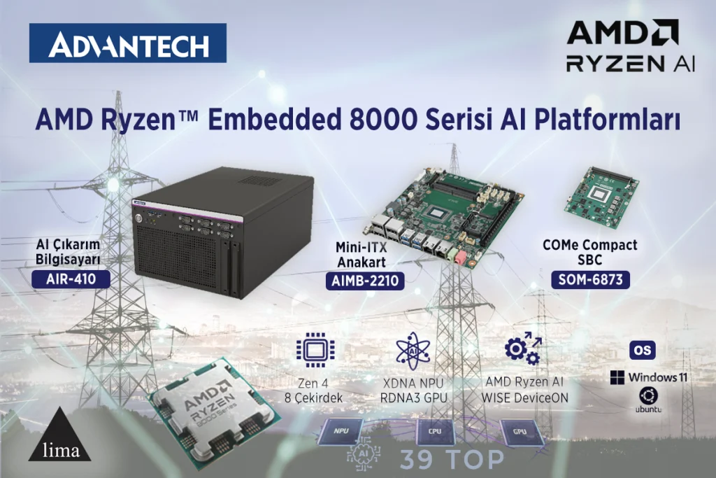 Advantech gelişmiş AMD Ryzen™ Gömülü 8000 Serisi işlemcileri kullanan yeni Edge AI çözümlerini piyasaya sürdü. SOM-6873 (COMe Compact), AIMB-2210 (Mini-ITX anakartlar) ve AIR-410 (AI Çıkarım Bilgisayarı), Yapay Sinir Ağı İşleme Ünitelerine (Neural Processing Unit : NPU) sahip AMD gömülü işlemcilerinden yararlanarak yüksek yapay zeka performansı sunmaktadır. Bu bütünleşik NPU’lar, yapay zeka çıkarım verimliliğini ve hassasiyetini artırmak üzere optimize edilmiştir. Geleneksel CPU ve GPU öğeleriyle birlikte bu mimariyi kullanan Advantech platformları 39 TOP’a kadar performans sunmaktadır.