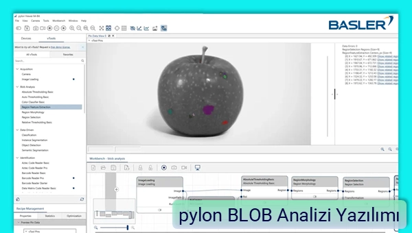 Yapay görme uygulamalarını işlevsel kılan öğe yazılımdır. Basler donanım portföyüne ek olarak; görüntülerdeki karanlık bölgeleri segmentlere ayırmak ve analiz etmek üzere pylon vTool ailesi içinde bir Blob Analizi Yazılım Modülünü geliştirmiştir. Blob analizi, gri tonlama değerlerine göre bir görüntüdeki farklı bölgeleri tespit eder. Bu tespitler ürünlerdeli kusurların, safsızlık veya benzeri farklılıkların tanımlanmasına ve uygun önlemlerin alınmasına olanak tanır.