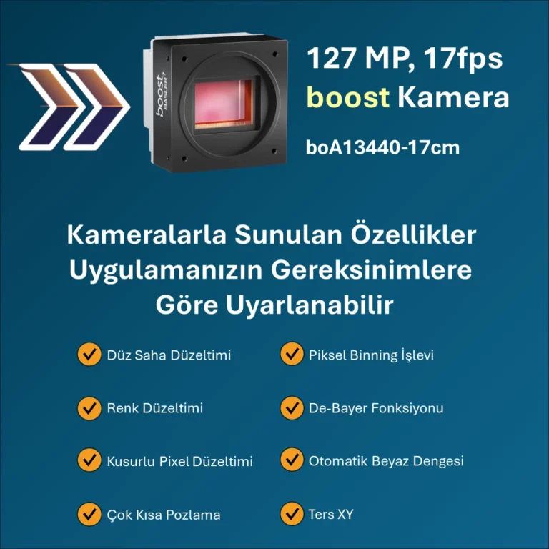 Basler’in boost R serisi alan tarama kameralarından olan boA13440-17cm  3.6″ (46.14 × 32.87 mm) boyutlarındaki Sony IMX661 sensörünü kullanır. Kamera 127MP ( 13376 px × 9528 px) çözünürlükte, saniyede 17 kare (17 fps) hızla monokrom görüntü yakalayabilmektedir.